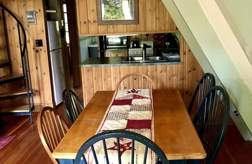 Little Peak will sleep four to six with a queen size bed in the master bedroom, comfy loft accessed via a spiral staircase with another queen bed, and a queen size sleeper sofa in the main living room. Little Peak Chalet also sports a dining room for six, full bath, completely equipped kitchen and deck peeking through the pines to Whiteface Mountain. Relax on your deck or roast hotdogs over your roaring bonfire.