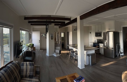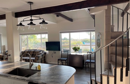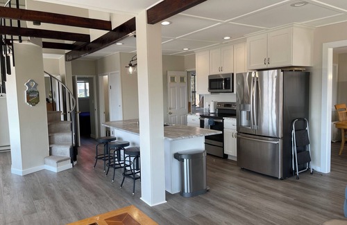 This newly renovated cottage sleeps 12 people and allows for four parking spaces or two with trailers. The four bedrooms each have a queen bed while the two upstairs bedrooms, accessed by a one-of-a-kind circular stairway, have space for a pack-n-play or provided inflatable beds. There are two full baths, one up and one down.