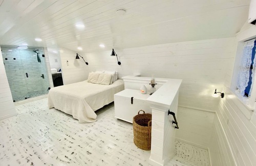 Escape to The Little White Barn a secluded 20-acre haven just 45 minutes from DFW. This charming retreat features a private pond and serene walking trails, perfect for a romantic getaway or honeymoon. The master suite, boasting a luxurious double shower, exudes a unique blend of Broken Bow's rustic charm and Magnolia's timeless elegance. Enjoy evenings by the fire pit, and immerse yourself in the cozy ambiance of shiplap walls and antique furniture. A true sanctuary for relaxation and adventure.