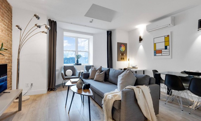 Experience the best of Downtown Montreal. Stay in this Spacious Deluxe 2-Bedroom Suite featuring soaring ceilings, curated artwork, a cozy lounge, Smart TV, fast Wi-Fi, and a fully equipped kitchen. Ideal for families, groups, or business travelers, this stylish retreat offers easy access to the city’s top restaurants, cafés, nightlife, shopping, and metro stations. A true Guest Favorite. Book now and experience the LiV MTL difference!