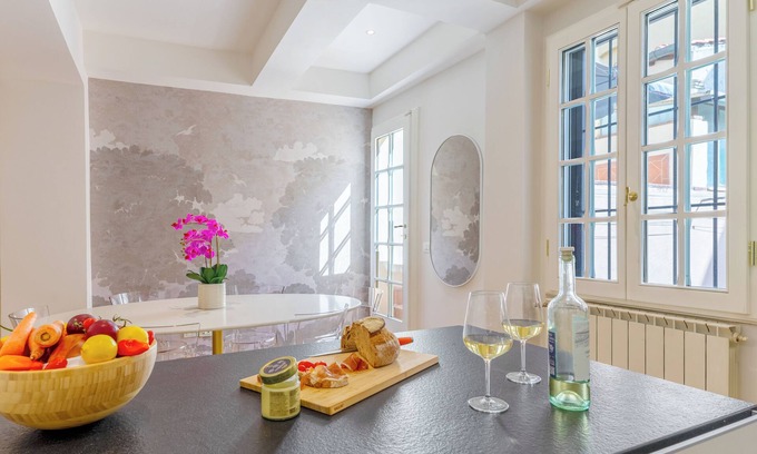 This designer apartment has a modern kitchen equipped with Nespresso machine, stove , oven, frig/freezer and all the pots and pans you need. The layout lends itself to a very comfortable stay with a Terrace off the dining area. There is a tv that is connected to the internet. Air Conditioning in all rooms