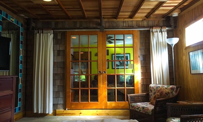 Completely renovated, our beautiful apartment for two is a true home away from home featuring one bedroom with a Queen bed, 32” HD TV, sliding French doors, custom tiled floor to ceiling mirror, one of a kind art, exposed beam hardwood ceiling with recess lighting, and a sitting area perfect for reading. The dresser provides ample storage space for clothes, shoes, and more. Blinds throughout provide your choice of sunlight or privacy.