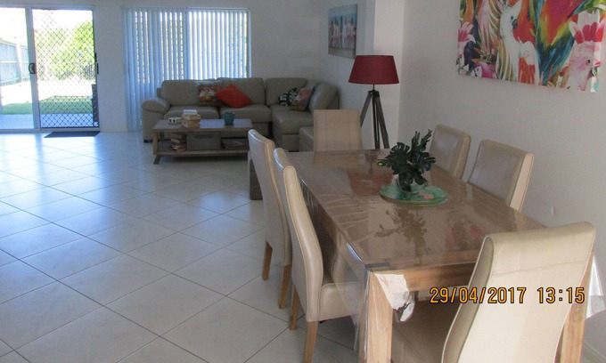 The property boasts three large bedrooms two queen size beds and the Master suite has a king size bed, ensuite and walk in robe. Upstairs has a retreat area and balcony to sit and enjoy the view or enjoy some quiet time. Downstairs is a large well equipped kitchen with dishwasher, microwave adjoining a dining area and family room, Foxtel, DVD player and CD/radio. A portacot is also on site. Enjoy the fully fenced backyard and gas BBQ and outside dining setting is provided for you enjoyment. Double garage is currently unavailable however there is adequate space for two vehicles to be parked off roadway.