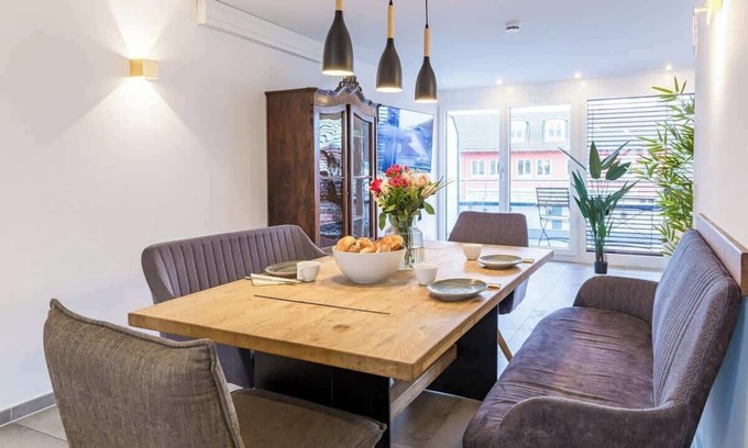 Just 20 minutes from Freiburg, this stylish apartment is located in the heart of Bad Krozingen on the historic Lammplatz. This central location combines urban flair with a relaxed atmosphere. Lammplatz offers cafés, restaurants and stores. Bad Krozingen is located in the Markgräflerland region, known for its vineyards, villages and wines. Thanks to its proximity to the border triangle, you can explore Germany, France and Switzerland - from Alsace to Basel, including art, culture and enjoyment.
