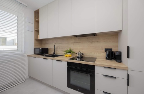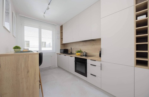 The apartment, located on the fourth floor of a modern building, is an exclusive offer for the most demanding guests who value comfort, aesthetics and the highest standard of finish. The bright, spacious interior has been decorated in the spirit of modern minimalism, with attention to every detail. The master bedroom features a luxurious double bed, guaranteeing complete relaxation, while the living area has a stylish sofa bed that easily converts into a comfortable sleeping space for two people. The spacious living room connected to a fully equipped kitchenette is the perfect place to relax and enjoy meals – from morning coffee at the coffee machine to dinner with a glass of wine. The comfort is complemented by a furnished balcony with a view of the surroundings, inviting you to take a break in the fresh air. The modern bathroom offers a walk-in shower, a set of high-quality cosmetics, soft towels and a washing machine, which makes the apartment perfect for longer stays. The whole is complemented by air conditioning, fast WiFi and a SmartTV+ TV, ensuring comfort and entertainment at the highest level. Guests travelling with their pets are also welcome – pets are allowed.
