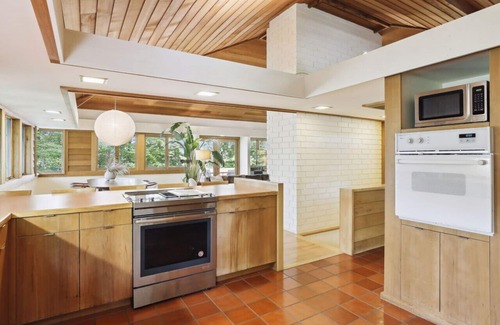More about the property: this sleek and clean 3-bedroom, 2-bathroom cedar home boasts a design style that reflects the iconic Frank Lloyd Wright characteristics, utilizing straight lines, sharp angles, and large windows that fill the house with natural light.