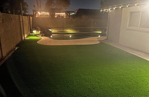 The backyard is Arizona landscaped and comes complete with yard games. Enjoy happy hour cocktails on the patio or go for a refreshing swim in the pool. This outdoor space also includes a stainless steel grill for evening cookouts. There are live cameras on the exterior of the house for security.
