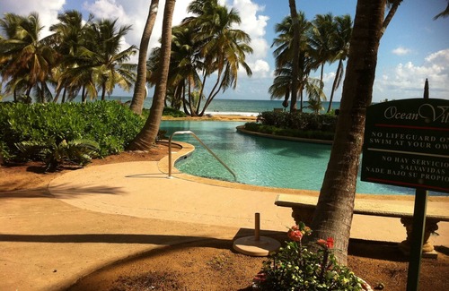 This breathtaking fully renovated and fully furnished garden style first floor two bedroom ocean-front villa is located in the heart of the Grand Wyndham Rio Mar Resort in northeastern Puerto Rico..considered America's closest island paradise. Come and appreciate direct oceanfront views from your two spacious balconies. Enjoy all the comforts of home with a roomy, comfortable living and dining area, a fully equipped kitchen, two full baths, three wall-mounted flat-screen televisions and a built -in washer and dryer. All of this privacy awaits your arrival with the addition of two beachfront pools and a hot tub--all for your pleasure. Top restaurants, two championship golf courses and the famous El Yunque Rainforest complete this property's allure for a vacation never to be forgotten.