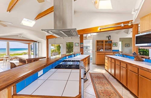 Hale Halia is just steps from Poipu Beach park with unparalleled oceanfront views and is a great family vacation destination. This lovely two-story floor plan is a design that takes full advantage of the magnificent Poipu coastline and sunset views. The large spa situated on the deck is the perfect place to relax and enjoy after a day at the beach. You can hear the waves crashing upon the shore from almost every bedroom and throughout the common areas of the home. The open great room features many windows and a large seating capacity to comfortably admire the fabulous views.