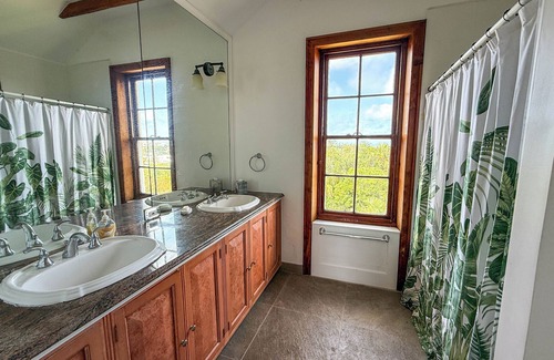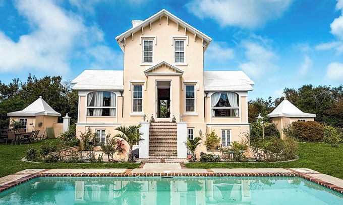 A unique experience awaits you at the historic Locust Hall in Devonshire, Bermuda. Situated in a working farm, this charming property has 3-bedrooms, and 3.5 bathrooms. Lush gardens encapsulate the house, ensuring total privacy for guests. Enter through the foyer into the main level where the living room, farmhouse kitchen and dining rooms, parlour, laundry, powder room, and butler’s pantry are located. On the lower level are two bedrooms with ensuite bathrooms and a family room with sofa-bed. The living room has direct access up to the pool deck. On the top level of the house is the primary bedroom with ensuite bathroom. The property dates to 1852 and has been restored keeping with its history, giving it a whimsical charm like no other.