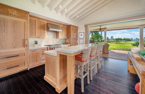 This vacation rental boasts 1,787 square feet of open-concept living space, featuring sleek design, high-end finishes, and a harmonious blend of indoor and outdoor living. The inviting living area is tastefully furnished with comfortable seating and adorned with tropical accents, providing the perfect place to unwind after a day of adventure. Large windows flood the space with natural light and offer views of lush landscaping, bringing the beauty of Kauai inside.