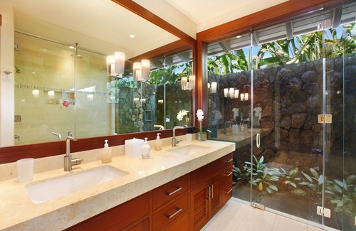 Four bedrooms are split between two seperate residences. Three bedrooms are located in the primary home, while a fourth bedroom can be found in the detached 'ohana, providing a unique private lodging option. This residence is within quick walking distance of the Club at Kukui’ula and overlooks the golf course with ocean views beyond. Guests have access to infinite amenities of the Club at Kukui’ula, including the 18-hole Tom Weiskopf designed golf course, sprawling spa and wellness complex, 10-acre organic farm, club house facilities, two restaurants and a complex of saline pools.