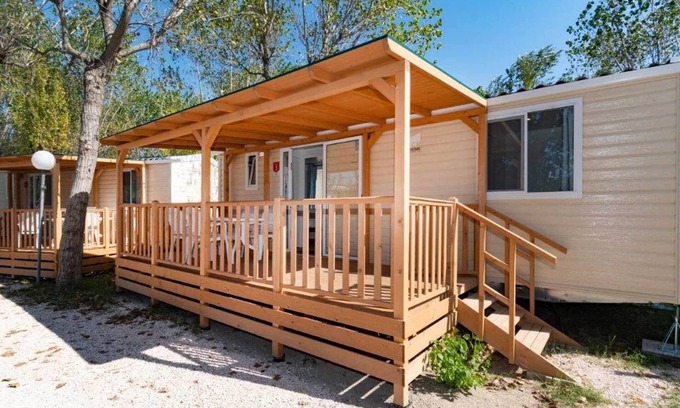 The perfect family holiday: located directly on the expansive beach of Rimini, the Rimini Family Resort offers everything for a wonderful break with your loved ones. Every family member can plan their days as they wish, because the park offers variety for young and old. You will live in a comfortable lodge that is equipped with everything you need for a pleasant stay. Each accommodation unit in the green has its own small veranda where you can end the day with a delicious glass of wine. This is what the resort offers: - Reception - Restaurant, pizzeria, bar - Supermarket, bazaar, newsstand - Beach service on over 35,000 square meters of beach (service for a fee, subject to availability) - Dog beach, dog pool and exercise area - Water park (open from around mid-May to mid-September) - Bicycle rental (also e-bikes) - Animation, mini club - Laundry - Various sports facilities, such as fitness, table tennis and much more - Playground - 1 parking space per lodge You will receive a wristband with a cashless payment system on site - so you can easily shop for your purchases and souvenirs at any time. Various excursions and guided tours are also offered on site. The friendly team will help you with advice. It is the ideal destination to discover Rimini and its nightlife. But excursions into the surrounding area are also worth a trip: for example, go to San Marino, the tiny state whose historic center will inspire you.