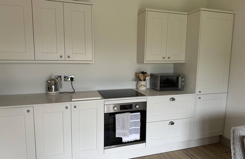 The kitchen has a fridge/freezer a hob, an oven, a kettle, and a microwave.