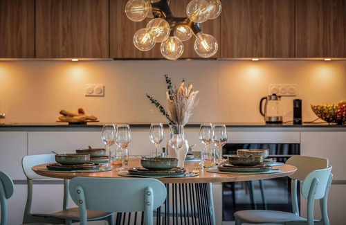 The bright, friendly living room has a cosy seating area with a sofa and armchairs in front of the TV. There’s also a lovely round table where you can share a meal, as well as a modern, fully-equipped kitchen.
