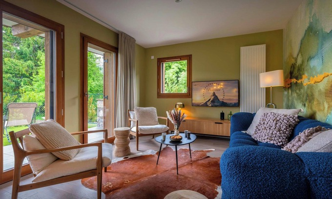 You can enjoy the fresh Alpine air from a terrace that extends into a small, flat garden. Relax on the sunbeds or enjoy a meal at the second dining table, which overlooks a grassy area. Lastly, convenient parking is available in the basement, which includes a garage with an electric door and a locked bicycle storage area.