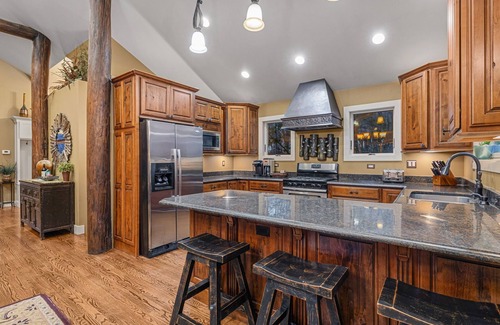 Posh and comfy living room couches and chairs provide fireside seating for sipping wine or simply chilling out to a movie or show on the large flat-screen TV. Hungry for a meal or snack? The high-end kitchen is fully equipped to help you serve up scrumptious food with joy and ease. With stainless-steel appliances, a Chef’s gas stove, a pro range hood, wraparound stone countertops, and all the primo cookware you could want, you’ll be able to fix up a great meal whenever the mood strikes! Morning coffee lovers? The breakfast nook is your hangout, but be aware—the Keurig habit may never leave you, as we provide only excellent coffee fixings for our guests! When your group feels it’s time for a formal meal, there’s a lovely dining room with great views to enjoy while sharing tasty vacation food together.