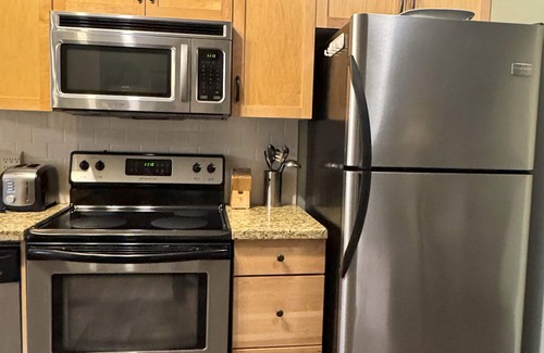 * Fully equipped kitchen features stainless appliances and granite counter tops.
