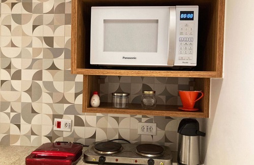 - Cozinha simples mas perfeita para preparar suas refeições, incluindo frigobar, exaustor, micro-ondas, fogão elétrico 2 bocas e balcão