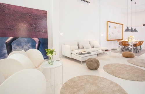 House design loft in white 2 minutes from the Paseo Maritimo de Palma, has two parking spaces, ideal for golf vacations, summer, or work in Palma. The light of the Mediterranean is the protagonist in all rooms of this house, the silence, together with the design in white and the art on its walls as well as its roof top make this space a special place for a relaxing and stylish stay in Palma. It consists of large living room and kitchen integrated loft type street, Patio, three double rooms, with living room and kitchenet, on the second floor. I Large terrace on the third floor.