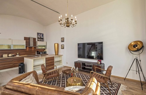This special loft has a style all its own. This beautiful landmark has been recently renovated with meticulous attention to detail. Open, spacious, tastefully decorated, and loft-style, living and sleeping here becomes a unique experience. Free parking is available in the courtyard. Heidenau train station is just 800 meters away. From there, you can reach Dresden's city center or Saxon Switzerland in just 20 to 30 minutes. Trains pass behind this industrial monument.