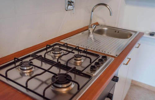 The apartment, nestled inside a courtyard, is very quiet. It’s on the ground floor and consists of an open-plan space with a fully equipped kitchen, a double sofa bed, and a mezzanine sleeping area with two single beds.