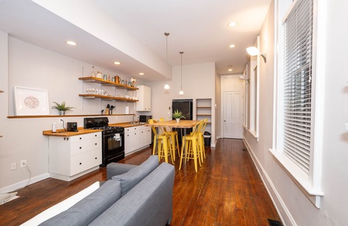 The home’s bright and contemporary interior is a welcome retreat from the energy of the city where you can relax and recharge between adventures. Kick up your feet on the living room sofa while you keep up on episodes of your favorite shows streaming on the smart TV. Steps away, grab a snack or prepare a meal in the fully equipped kitchen with ample counterspace and cabinetry for preparation and storage. The chic high-top dining table can accommodate 4 for meals, games, or even catching up on those stubborn work items.