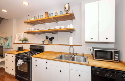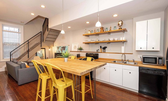 The home’s bright and contemporary interior is a welcome retreat from the energy of the city where you can relax and recharge between adventures. Kick up your feet on the living room sofa while you keep up on episodes of your favorite shows streaming on the smart TV. Steps away, grab a snack or prepare a meal in the fully equipped kitchen with ample counterspace and cabinetry for preparation and storage. The chic high-top dining table can accommodate 4 for meals, games, or even catching up on those stubborn work items.