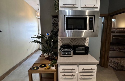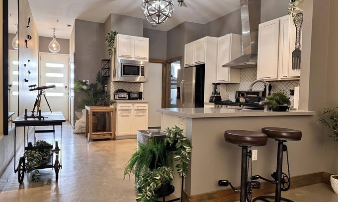 Experience San Antonio in this stylish 2-bedroom loft! The primary bedroom features a plush queen bed, while the second bedroom offers a cozy bunk be. The living room has a pull-out couch for extra guests. Enjoy your morning coffee on the private balcony, or cook in the fully-equipped kitchen. Located minutes from the Pearl District, River Walk, and the Alamo. Perfect for families or small groups, this urban retreat has it all!