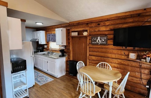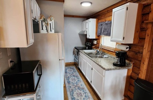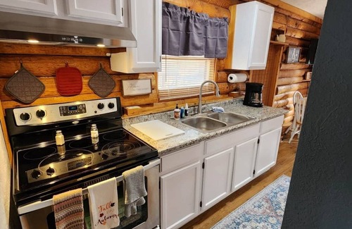 The kitchen has pots, pans, plates etc. You will need to bring spices and your food. The cabin has a gas grill. You will need to bring firewood. There is a gas station and Dollar General conveniently located 5 minutes form the cabin.