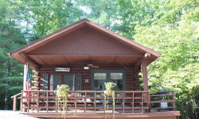 This cabin has 1 bedroom with a queen bed and full sofa bed, living area with sofa bed, streaming channels, electric fireplace, kitchen, full bathroom, and covered porch with outdoor furniture & ceiling fan. Fire pit.