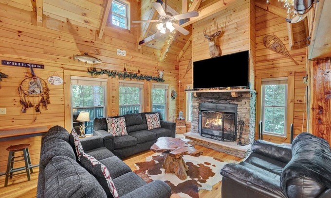The cabin also has a wood-burning fireplace in the living room, a Jacuzzi tub in master bath, a Pool Table and Bar in our finished basement and an outdoor fire pit and charcoal grills!