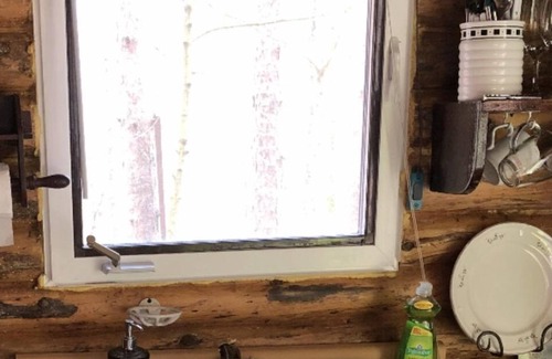 the interior of the cabin is equipped with a couch and table and chairs. dishes and cutlery are provided. There’s a French press for making coffee. Coffee is not provided for the press.
