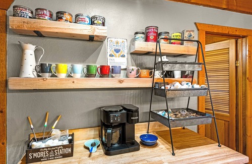 The yard is a highlight with rocking chairs circling the real wood fire pit, a hammock, and games like horseshoes and cornhole. It’s easy to linger outdoors, soaking in the pine breeze under the mountain sky.