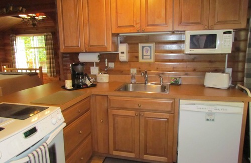 This cabin has: 1 Bedroom (Queen bed, linens included), a well equipped kitchen with Jenn-Air electric range, microwave, full size refrigerator and a dishwasher, 1 Large bathroom with shower (towels included), a washer & dryer, gas Fireplace, living room with a TV, as well as a game cabinet and a large selection of games and cards, high speed DSL connection, outside Gas Grill, and a Fire pit – for use when there is no burning ban.
