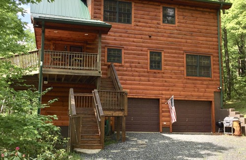 Beautiful, modern log cabin located on 9 private acres right off the Blue Ridge Parkway. At an elevation of 3,300 feet, the cabin has gorgeous views of the NC mountains. The cabin has a fully equipped gourmet kitchen, 4 bedrooms, 3 full baths and sleeps 8. The open floor plan is great for group gatherings, with floor to roof windows looking out on the distant mountains. The cabin has a large wraparound porch, a covered picnic table for outdoor dining, a large hot tub for soaking and relaxing after enjoying the many nearby outdoor activities, and a fire pit to gather around in the evenings. This property is located Ashe County and is perfect for those looking for peace and quiet in the middle of the woods, but with close proximity to outdoor activities like hiking and rafting, as well dining and other recreational activities in the West Jefferson and Boone areas. Couples, families and nature enthusiasts will fall in love with this place.