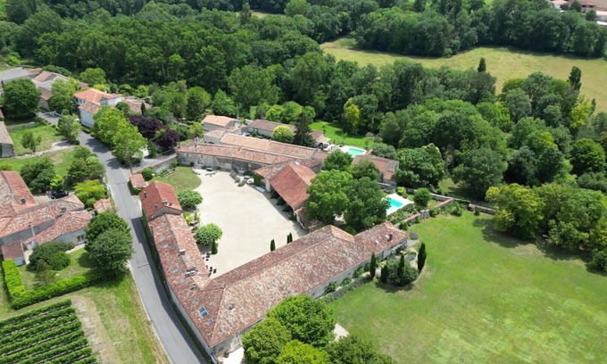This former 18th-century wine estate in the heart of the Charente countryside is available for exclusive rental and can host up to 27 guests in complete privacy.