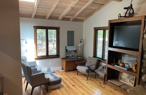 The cabin offers 3 bedrooms - all with a view into the surrounding woods. The large bathroom has a tiled tub & shower, and also offers a washer and dryer. Cooking is easy in the galley-style kitchen and there is room for the whole family around the large butcher-block island. At the end of the day - settle in by the fireplace or maybe play cards around the dining table. The living space is very spacious with lots of cozy seating options.