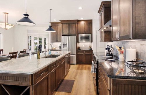 Fully equipped kitchen and large dining room table with additional island and window table seating.
