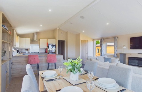 All on one level: 2 x bedrooms, one king double bedroom with walk in wardrobe, TV and en-suite shower room, one twin bedroom with walk in wardrobe. Family bathroom, with bath and shower over, basin and WC. Open-plan living area with fitted integrated kitchen, sitting and dining areas, and patio doors leading out onto the wrap around decked balcony. Note: There are 4 steps up to the decking and side door.
