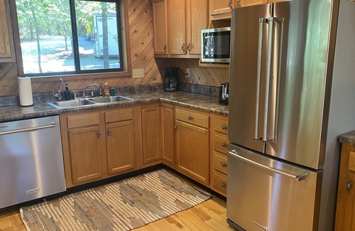 This pet-friendly chalet is the epitome of indoor-outdoor living. Enjoy gorgeous sunsets while gathering for meals on your deck, relaxing in the hot tub, chatting by the fire pit, napping in the hammocks, fishing on the dock, or participating in lakeside activities. Take advantage of the adult and child-size kayaks, paddleboard, paddle boat, and canoe on your private sand beach. Rinse the day away in your outdoor shower before entering the comforts of home. This property consists of gentle slopes allowing easy amenity access for all ages.