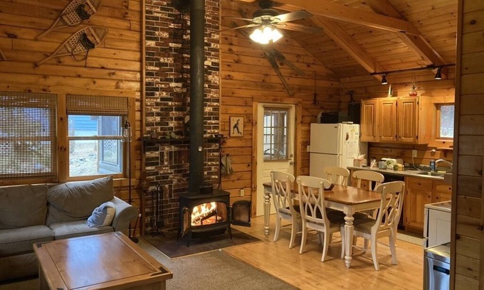 The cabin is located at the end of a dead-end private dirt road that sees little to no traffic. The rear is wooded and has a campfire area (wood provided). The cabin is not lake front, but sits just one house in. It is a true log cabin with a vaulted wood ceiling and knotty pine interior.