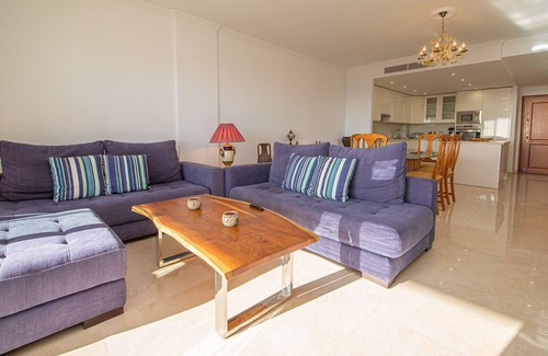 Lovely large 2 bedroom, 2 bathroom apartment located in the popular complex of Los Castillos. The apartment has been completely refurbished to a very high standard with an American style open plan kitchen / lounge with direct access to the terrace. The apartment benefits from it's own WiFi connection, air conditioning in the lounge and the 2 main bedrooms, 2 bathrooms that have been fully refurbished and a large terrace that has views of the sea. There is also a parking space available. The apartment is just a 5 minute walk to the marina and it's bars and restaurants.The complex is fully gated and has a communal swimming pool. The Courtyard at Monte Duquesa is also just a short stroll and has a selection of bars and restaurants.Communal facilities are subject to availability.
