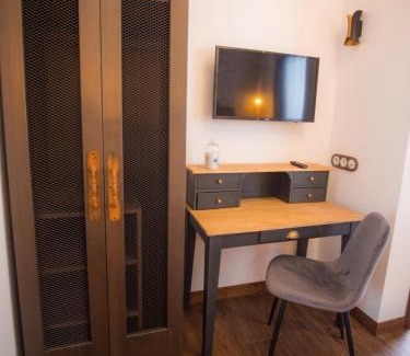 Food & DrinkTea/Coffee makerBathroomShampoo, Bathtub or shower, Private bathroom, Towels, Body soap, Shower, Hairdryer, Free toiletries, Toilet, Toilet paperMedia & TechnologyTV, Flat-screen TVGeneralAir conditioning, Smoke Alarm, Ironing facilities, Heating, Trash cans, Iron, Private entranceOutdoorsPatio, BalconyKitchenMicrowave, Refrigerator, Coffee machine, Washing machine, Dining table, Wine glasses, Kitchenware, Cleaning productsLiving AreaFireplace, Dining area, Sofa, DeskViewView, Quiet street view, City viewBedroomLinens, Wardrobe or closetAccessibilityUpper floors accessible by stairs onlyEntertainment & Family ServicesBoard games/puzzlesRoom AmenitiesHypoallergenic pillow, Socket near the bed, Sofa bedPool and SpaPool towelsPhysical distancingSingle-room AC for guest accommodation |