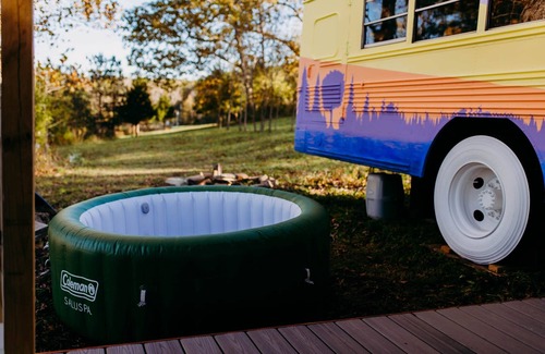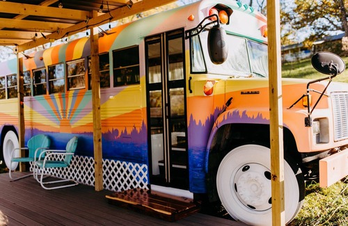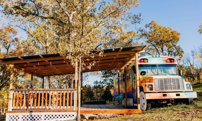 Disconnect, relax, and enjoy!! WOW, what a find! This glamping Sunshine Skoolie is only 1 hour from St. Louis, MO, located on 200 acres of private land. We welcome guests to connect with nature and enjoy all the fun things the property has to offer. Private lake swimming/fishing, private access to the Meramec River, hiking trails, and so much more! The bus offers comfortable amenities, such as air conditioning, heat, cozy seating, lovely mattresses, and a private outdoor hot tub.