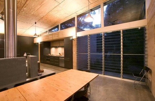 It is constructed of materials with a raw feel including rammed earth, polished concrete, plywood, steel and glass. It offers simple, and comfortable, modern accommodation in two separate pavilions which open to a private, grassed courtyard, with the National Park beyond.