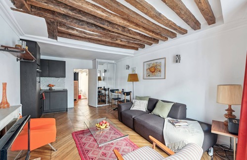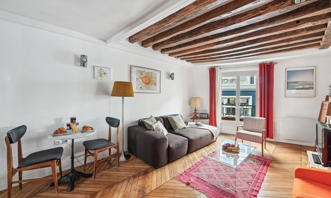 Enjoy staying in the heart of Paris’s Montorgueil Quarter area with this lovely 1-bedroom, 35 square meters apartment located on the 5th floor of a secure residential building WITHOUT an elevator. Self check-in starting from 3:00PM by picking up keys at a nearby shop. Wi-Fi is available, great for both work and leisure. A refundable damage deposit is required, in full accordance with platform's policies.