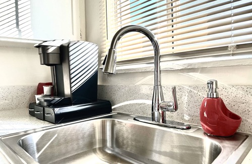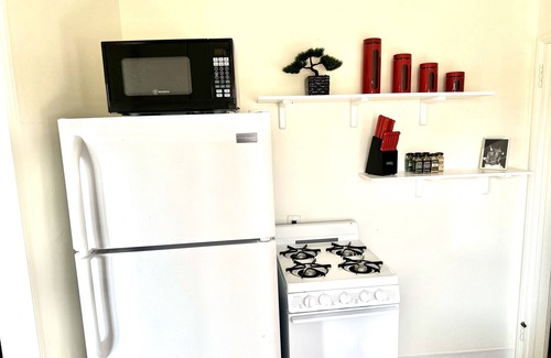 Kitchen: gas stove, full size refrigerator, toaster, K-Elite Keurig coffee maker, microwave, cooking and baking sets...
