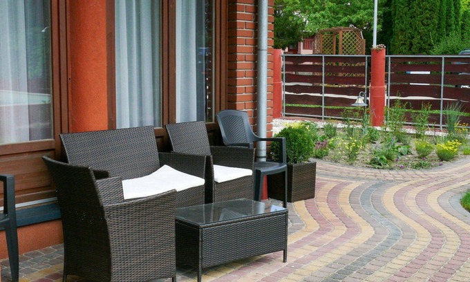 The vacation rental is situated 500 meters from the lake and 300 meters from the center of the resort area in Balatonkeresztúr. Nearby attractions include the town of Keszthely, which is approximately 20 km away.