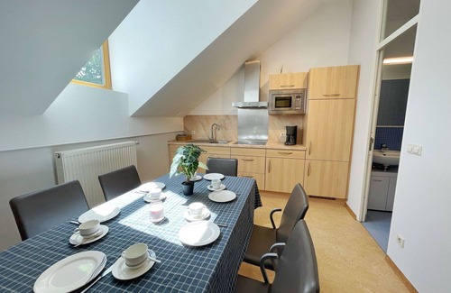 The open kitchen is well-equipped with 4 hot plates, a dishwasher, toaster, kettle, microwave, and an electric coffee machine. The apartment also offers a shower/WC. Internet access is available via WiFi and is provided free of charge.
